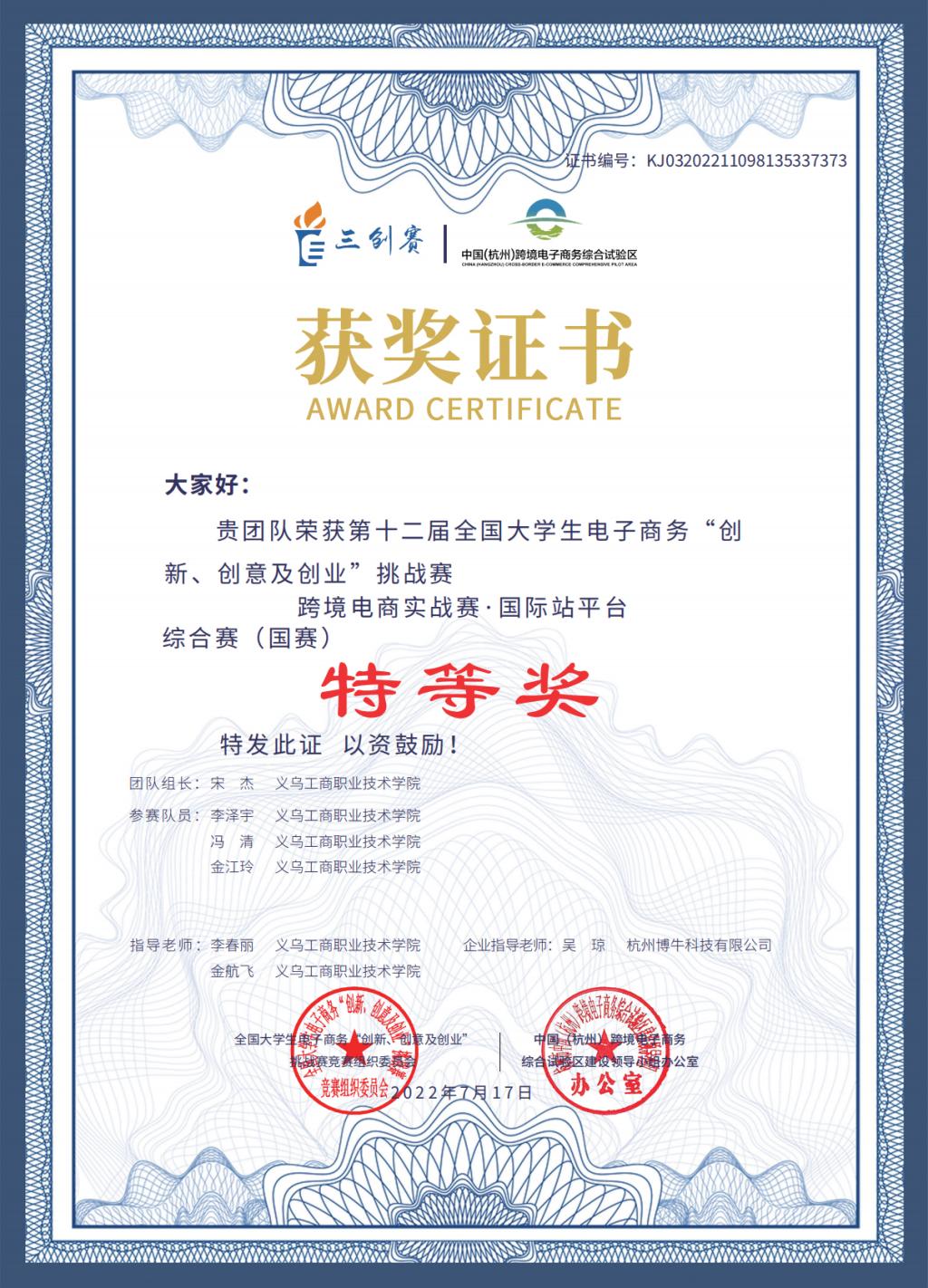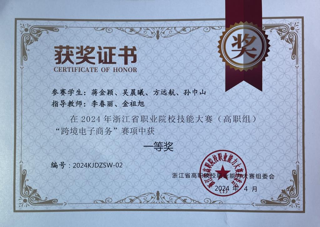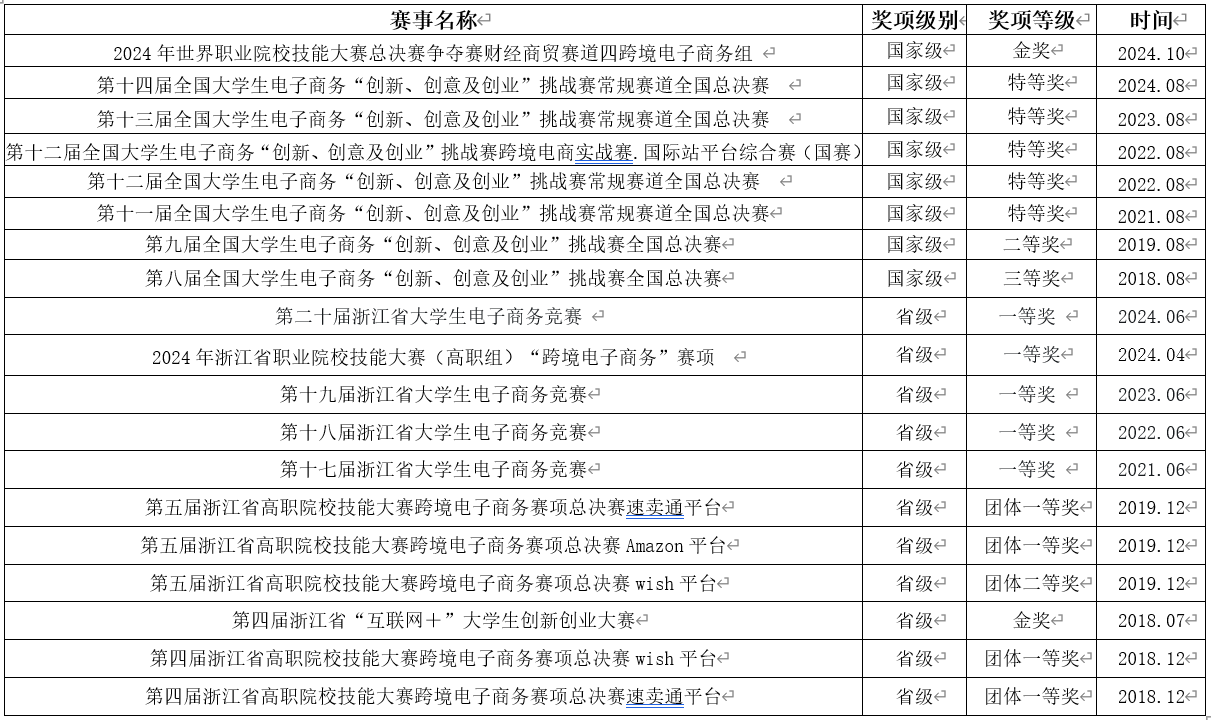 专业教师参与项目《跨境电子商务紧缺人才培养体系的构建与实践》,荣获2018年职业教育国家级教学成果二等奖;专业教师参与高职本科跨境电子商务专业《职业教育专业简介》和《职业教育专业教学标准》修(制)订工作;专业教师建设课程《跨境电子商务实务》,于2019年获评浙江省高校教育信息化优秀案例,2020年获评浙江省高职院校“互联网+教学”优秀案例一等奖,2021年入选第一批省级课程思政示范课程立项名单(高职),其相应的在线课程《跨境电商创业》获评2022年职业教育国家在线精品课程;专业教师开发《跨境电商创业》《跨境电商B2B实务》《跨境电商物流理论与实务》等多部新形态教材;专业组织学生参与跨境电商B2B/B2C数据运营职业技能等级证书(中级)考试,通过率为100%;专业教师指导学生参加跨境电商技能大赛,以及创新创业类相关比赛,取得了丰富的成果,2024年世界职业院校技能大赛总决赛争夺赛财经商贸赛道四(跨境电子商务赛项) 金奖。