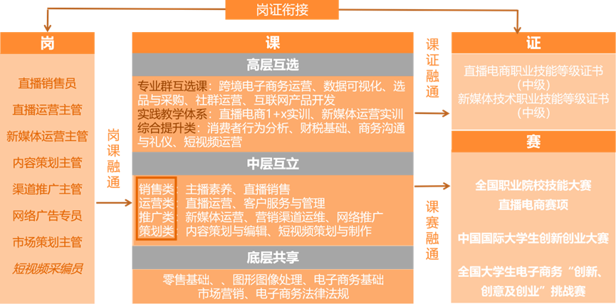网络营销与直播电商专业的课程体系由专业基础课、专业核心课和专业拓展课组成。对接岗位要求,专业基础课注重培养专业基础知识,专业核心课注重积累岗位知识和直播相关实践能力,专业拓展课注重训练直播相关技能和职业素养。另外,学生还可通过自主创业、校内实训基地和校外企业实习等多种方式提升专业知识与实践技能。