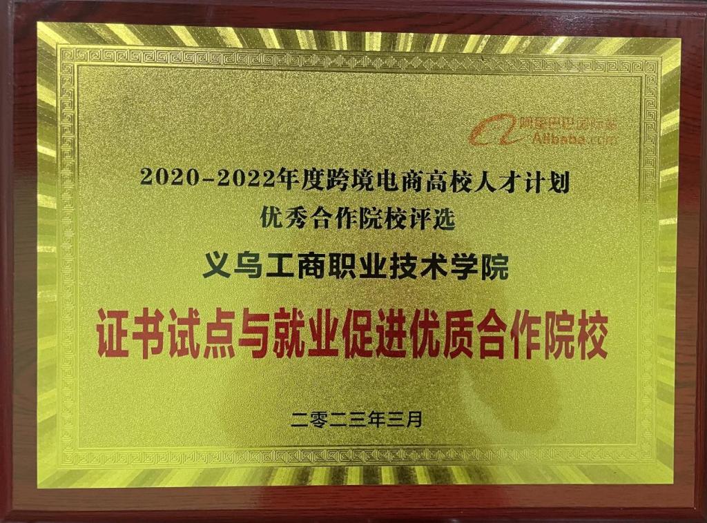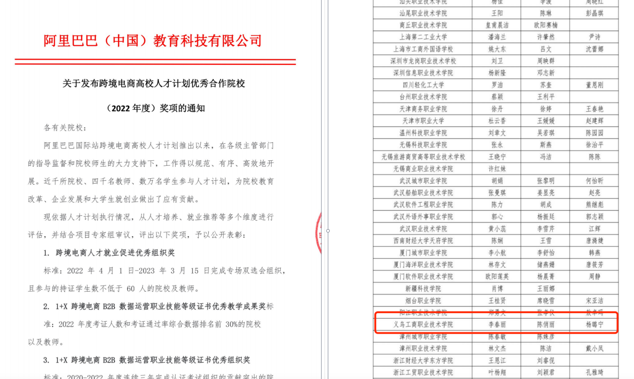 近日,阿里巴巴(中国)教育科技有限公司公布了《关于发布跨境电商高校人才计划优秀合作院校(2022年度)奖项的通知》,我校荣获“1+X跨境电商B2B数据运营职业技能等级证书优秀教学成果奖”和“1+X 跨境电商B2B数据运营职业技能等级证书优秀组织奖”,我校教师李春丽、陈俏丽、杨璐宁荣获优秀教师。同时,我校被授予“证书试点与就业促进优质合作院校”。