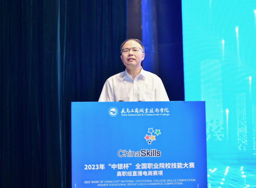 祝鸿平致辞,他指出,全国职业院校技能大赛的举办有利于推动职业院校以赛促教、以赛促学、以赛促改,深化“三教”改革,不断推进“岗课赛证”综合育人。今年浙江省是全国承办赛项最多的赛区之一,直播电商赛项是首次进入国赛舞台的比赛项目,为职业院校提供了新的交流平台和竞技舞台。他表示浙江教育厅一定认真落实大赛各项要求,坚持高起点、高标准、严要求,公平公正地组织大赛工作,保证赛事顺利进行。希望所有参赛队伍能够以大赛为契机充分展现所学知识和技能,超常发挥,展现新时代技能人才的精湛技艺和精神风貌。
