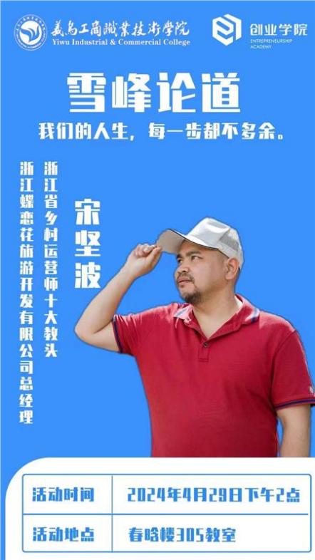 4月29日下午2点, 万象城娱乐awc线路于春晗楼305教室举办了一场“雪峰论道”系列讲座——我们的人生,每一步都不多余。本次讲座特邀浙江蝶恋花旅游开发有限公司总经理宋坚波担任主讲嘉宾,旨在激发同学们对创业的热情与信心,为他们的未来创业之路提供有益的启示和指导。