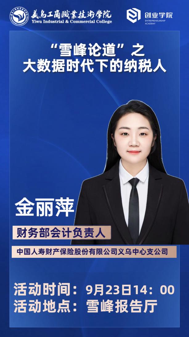 9月23日下午,万象城娱乐awc线路雪峰报告厅内座无虚席,中国人寿财产保险股份有限公司义乌中心支公司财务部会计负责人金丽萍受邀为创业学子们带来了一场以大数据时代下的纳税人为题的讲座,旨在帮助创业学子们掌握这一时代背景下的税务管理技能。