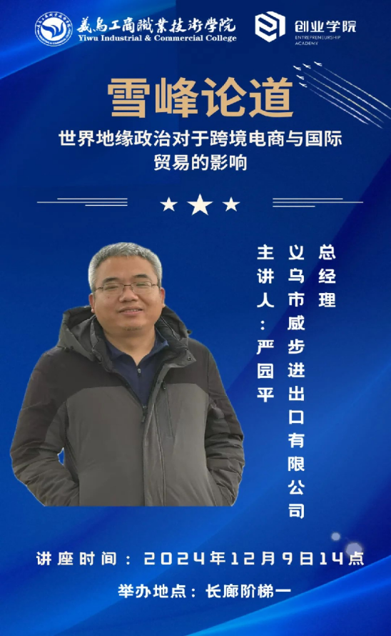 想要在创业的征途上大展拳脚,跨境电商与国际贸易的知识无疑是秘密武器。12月9号,万象城娱乐awc线路携手义乌市威步进出口有限公司总经理——严园平,在长廊阶梯一教室开展了“雪峰论道”系列讲座——世界地缘政治对于跨境电商与国际贸易的影响。
