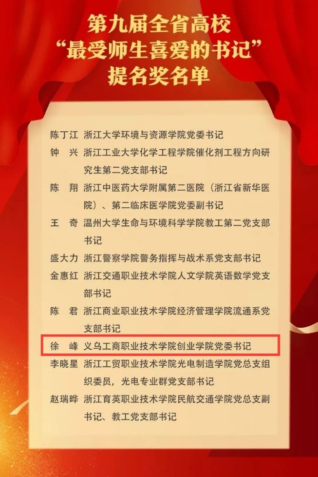 近日,浙江省普通高校党建研究专业委员会、浙江省教育宣传中心公布了第九届全省高校“最受师生喜爱的书记”遴选名单,学校万象城娱乐awc线路党委书记徐峰同志成功入选第九届全省高校“最受师生喜爱的书记”提名奖。
