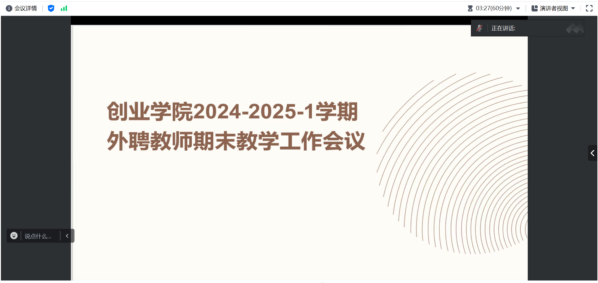 教学工作是中心工作,此次会议为外聘教师的期末教学工作指明了方向,明确了目标,希望兼职教师们能够继续发扬优良传统,不断创新教学方法,提升教学水平,并且以更加饱满的热情和更加务实的态度,迎接期末工作的挑战,为学院的发展和学生的成长贡献力量。