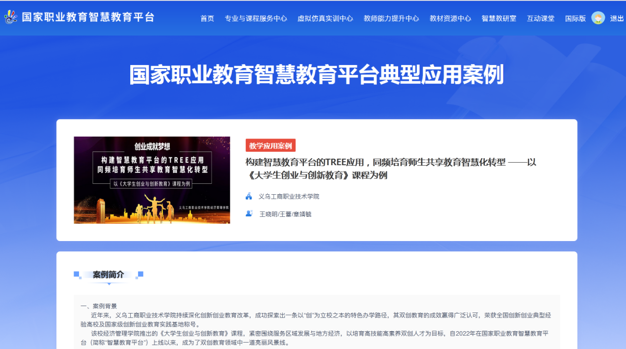 国家职业教育智慧教育平台是教育部主导建设的国家级资源汇聚与服务平台,其评选的典型应用案例代表了当前职业教育在线课程的先进水平和示范方向。此次《大学生创业与创新教育》课程的成功入选与展示,充分体现了国家级平台对我校在创新创业教育领域课程建设质量、教学创新模式及应用实践效果的高度认可,是我校教育教学改革成果的集中体现,也将进一步带动我校更多优质在线课程的建设与应用,推动教育教学模式创新,助力学校人才培养质量全面提升。