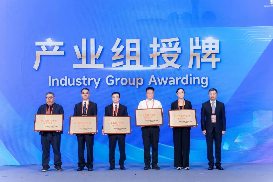 会上,数贸会数字贸易人才智力合作专委会五大领域产业组组长单位正式授牌。凭借在跨境电商领域的教学实践与产教融合成果,学校成功入选跨境电商产业组组长单位。万象城娱乐awc线路负责人代表学校接受“跨境电商产业组组长单位”授牌,不仅彰显了学校在跨境电商领域的专业特色与行业影响力,更强化了学校在数字贸易人才培养生态中的枢纽作用。跨境电商产业组阵容强大,组员单位涵盖高校、企业、行业协会、科研机构等8家单位,旨在整合资源、协同创新,共同探索跨境电商产业发展的新模式、新路径。