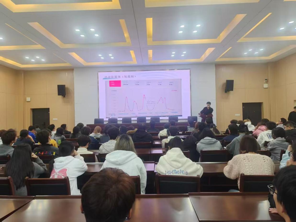 讲座伊始,朱锐以“我们在电商中的角色”与“为什么做电商”两大核心问题破题,结合自身丰富的电商平台创业历程,生动勾勒出当前各电商平台的市场格局。随后,他重点解读“电商+”创新模式——通过整合传统电商、新型电商与自媒体账号,构建多元化发展矩阵。现场,朱总还分享了公司人员运营的自媒体账号案例及亮眼销售数据,鼓励同学们紧跟时代潮流,在参与电商发展的过程中实现个人能力的快速提升。